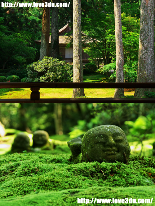 寺内的主尊阿弥陀如来像和两边的伺像均是国家级重点文物。庭园中青苔密生,杉树蔽日。后院的自然林中约有3000棵紫阳花。每逢梅雨季节,鲜花盛开,景色醉人。