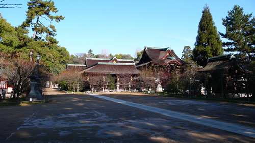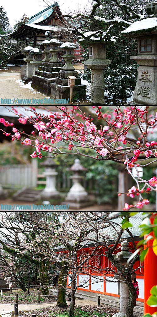 以赏梅名胜著称的京都市上京区北野天满宫。每到2月25日道真的忌辰天满宫都会举办梅花节,这一传统延续至今已有大约900年的历史。