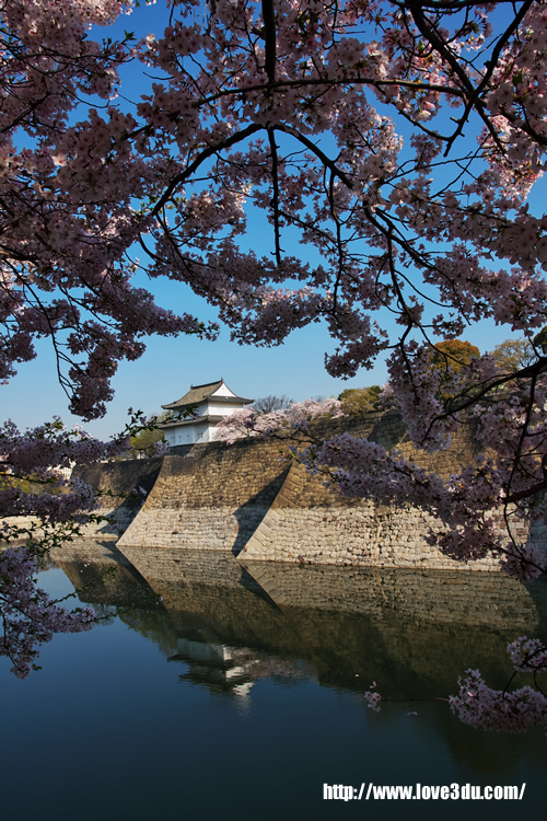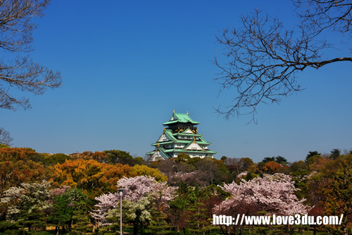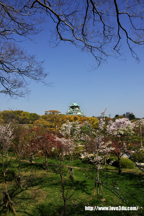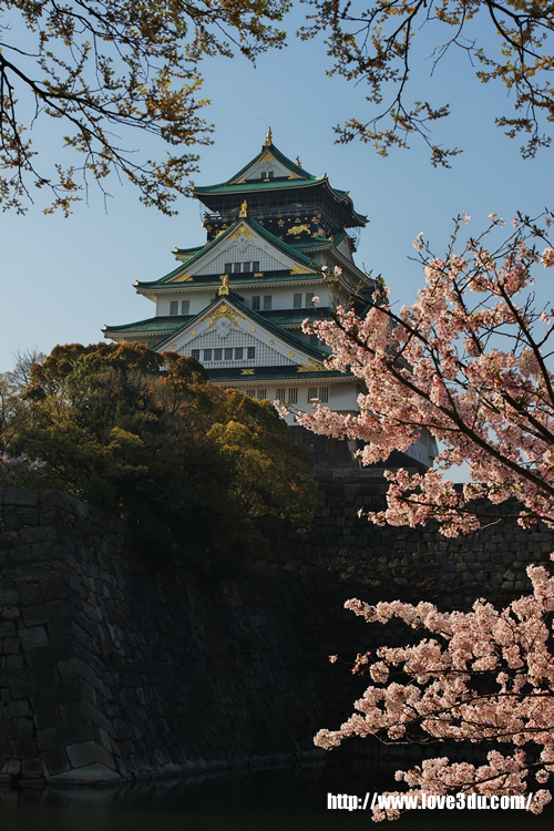 现存的大阪城为1931年由民间集资重建,外观看上去象5层,但内部共有8层,楼高54.8米,7层以下为资料馆,8层为瞭望台。城墙四周建有护城河,附近有风景秀丽的庭园和亭台楼阁。漫步河边,奇花异卉,满目青翠,充满诗情画意。大阪城公园2月底是赏梅花、4月初是赏樱花的好季节。